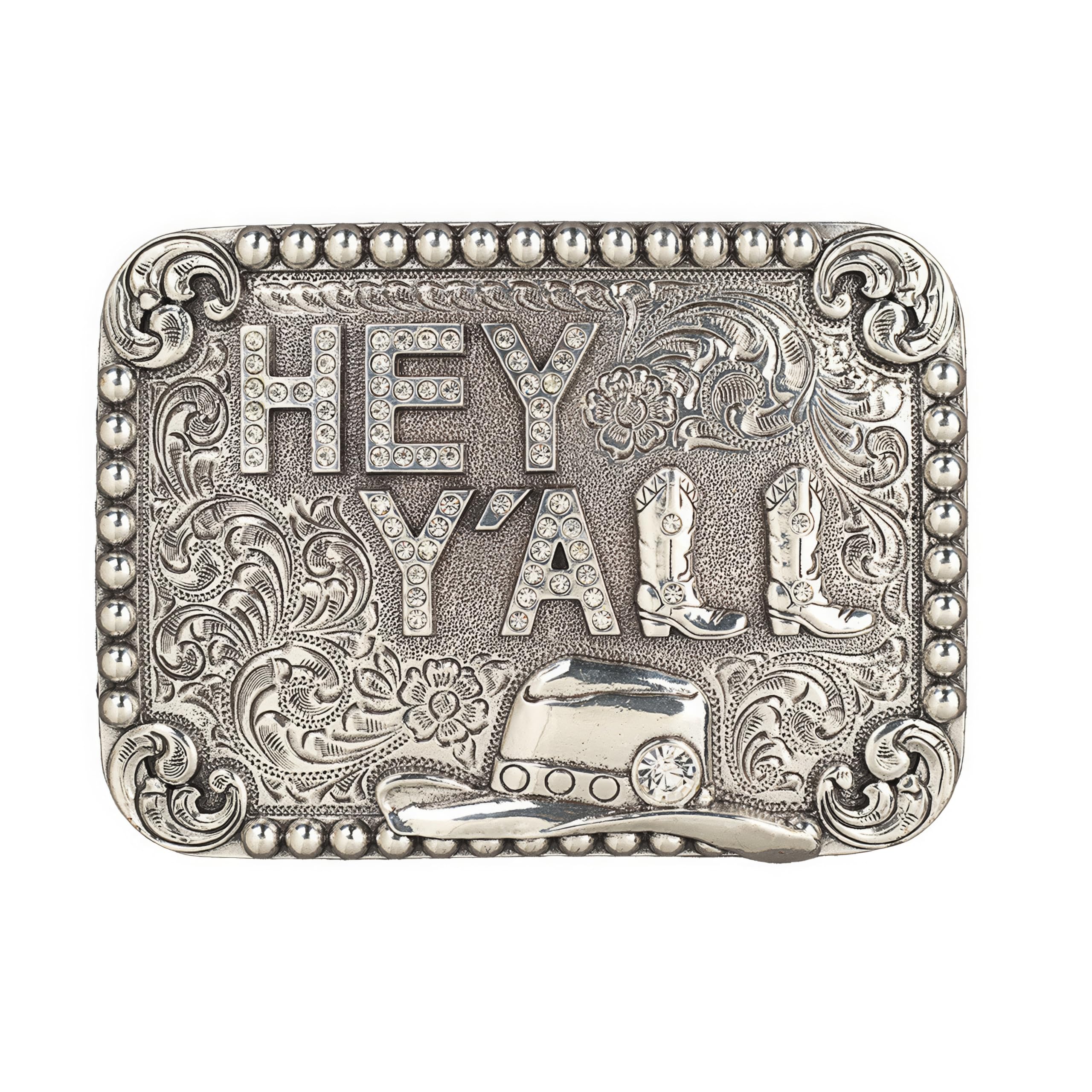Blazin Roxx Women’s ‘Hey Y’all’ Crystal-Embellished Buckle with Cowgirl Hat (Antique Silver, 2-1/4″ x 3-3/4″)