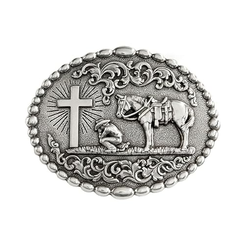 M&F Western Products Products Nocona Silver Oval Buckle with Beaded Edge, Cowboy at Cross and Horse Motif, 3-1/8″ x 3-7/8″