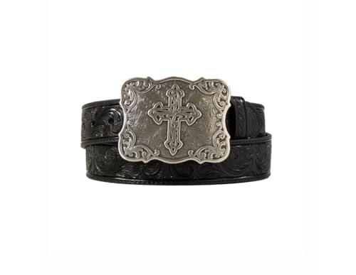 Nocona Ladies belt by M&F Western Products. Black leather with scrolling and crosses embossed on the strap. The buckle is antique silver finish with a raised engraved Cross and scrolling in the background. Available in sizes S-XL.